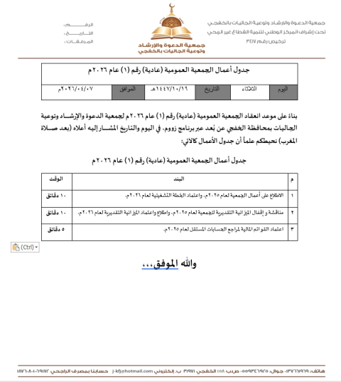 دعا مجلس إدارة جمعية الدعوة والإرشاد وتوعية الجاليات بالخفجي لانعقاد اجتماع الجمعية العمومية الأول (عادية) لعام 2026م وذلك في يوم الثلاثاء 19-10-1447هـ الموافق 07-04-2026م،...