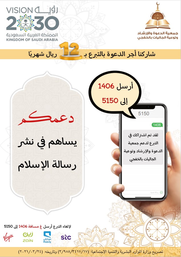 نستقبل تبرعاتكم عبر مشروع الدعم عن طريق الرسائل من خلال التبرع بمبلغ 12 ريال شهرياً وذلك بإرسال رسالة نصية SMS تتضمن إرسال الرقم 1406 إلى الرقم 5150 من جميع شركات الاتصالات .