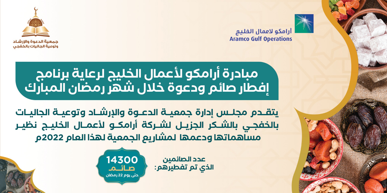 استقبلت إدارة جمعية الدعوة والإرشاد وتوعية الجاليات بالخفجي من شركة ارامكو لأعمال الخليج تبرعاً سخياً مبلغ (300000) ريال ، لمشاريع الجمعية لهذا العام 2022م .