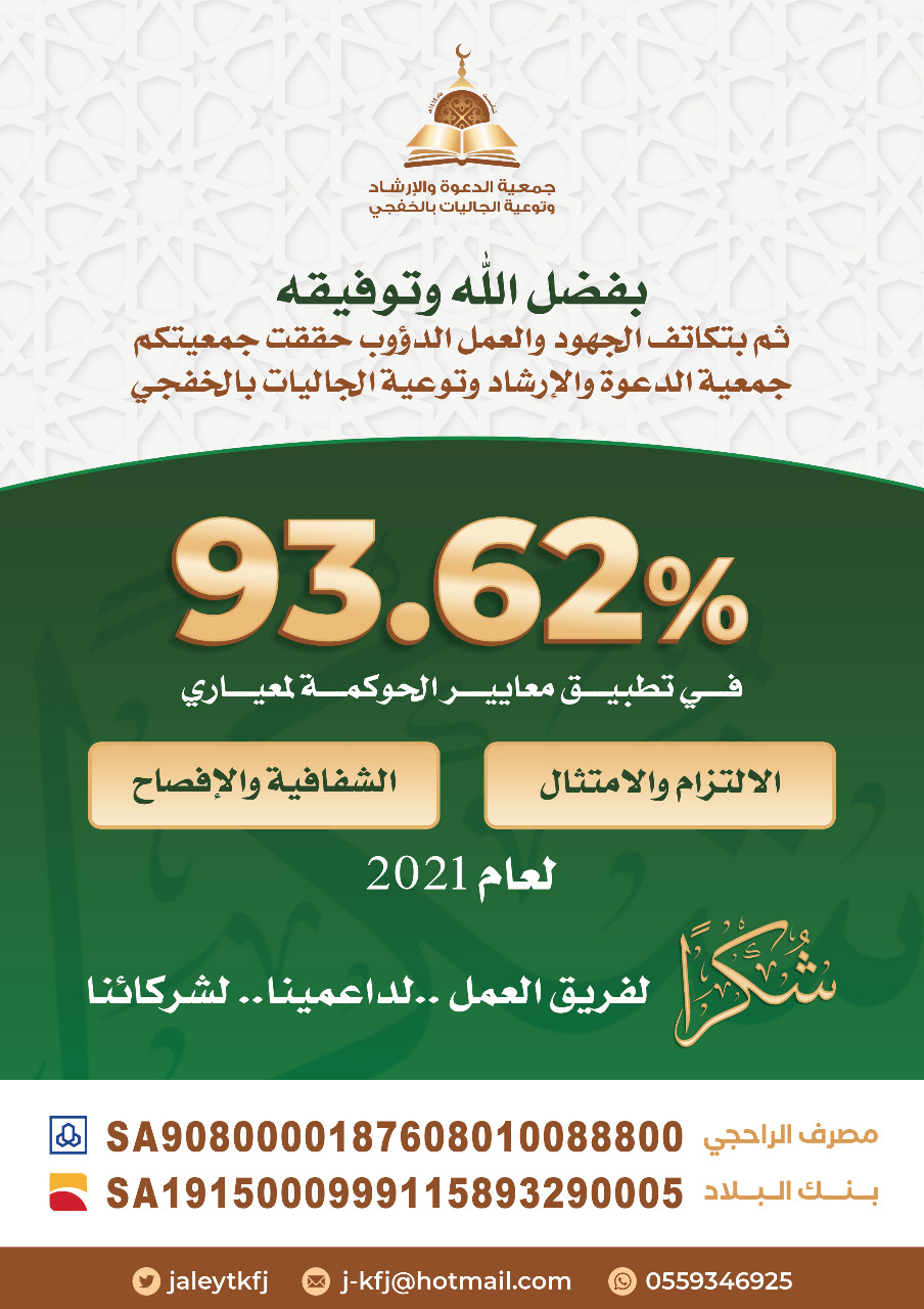 العرض > حصلت جمعية الدعوة والإرشاد وتوعية الجاليات بالخفجي في درجة الحوكمة على 93.62٪