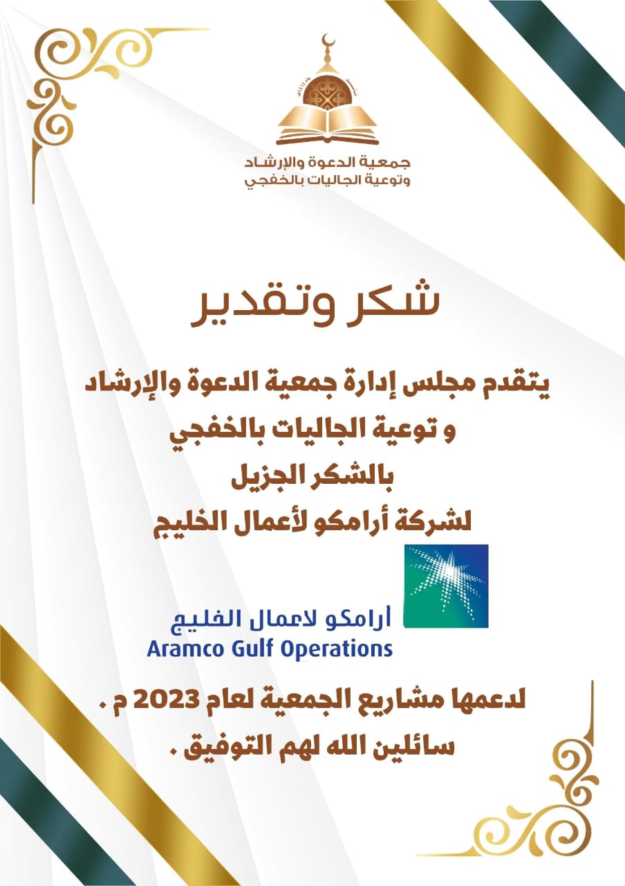 استقبلت إدارة جمعية الدعوة والإرشاد وتوعية الجاليات بالخفجي من شركة ارامكو لأعمال الخليج تبرعاً سخياً مبلغ (300000) ريال ، لمشاريع الجمعية لهذا العام 2023م .