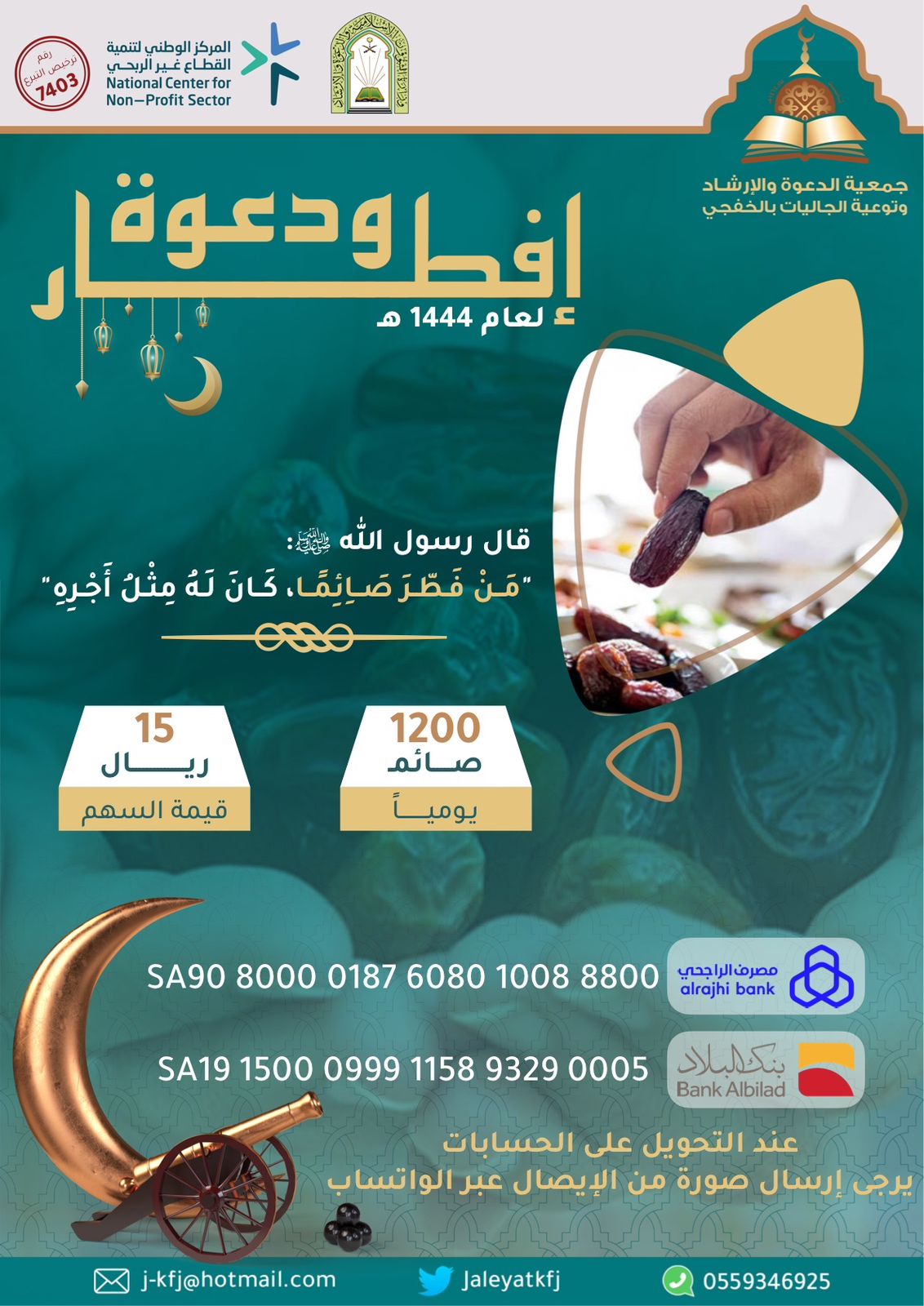 ولفت المدير التنفيذي: بدر بن خلف العنزي إلى أن مشروع إفطار ودعوة يعتبر أكبر مشروع للجمعية، ونحث المواطنين وأهل الخير على التبرع وتفطير الصائمين علماً بأن قيمة السهم (15 ريال) عن طريق زيارة الجمعية أو الإيداع في حساب الجمعية لدى