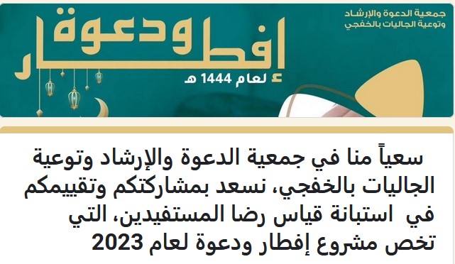 سعياً منا في جمعية الدعوة والإرشاد وتوعية الجاليات بالخفجي على قياس رضا المستفيدين، نسعد بمشاركتكم وتقييمكم لمشروع إفطار ودعوة لعام 2023